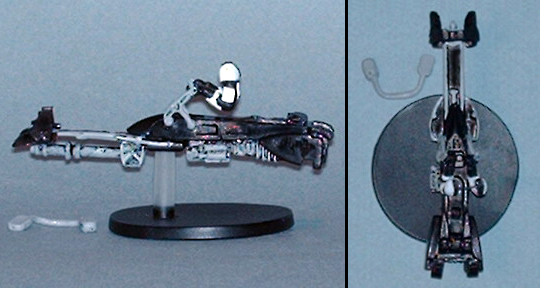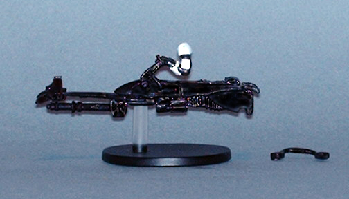 The last variation requires only a Scout Trooper on Speeder Bike. Pull the arms from the Scout Trooper, then carefully pull the Scout Trooper from the bike. Paint the bike black including the arms holding the handle bars. Paint the Scout Trooper black and the eyes of the visor bright green. Dry-brush the engine and paint the fork bars and the foot pedals a very dark gray, as described above. Glue the Scout Trooper back into position. Now you have a Storm Commando on Stealth Speeder Bike.